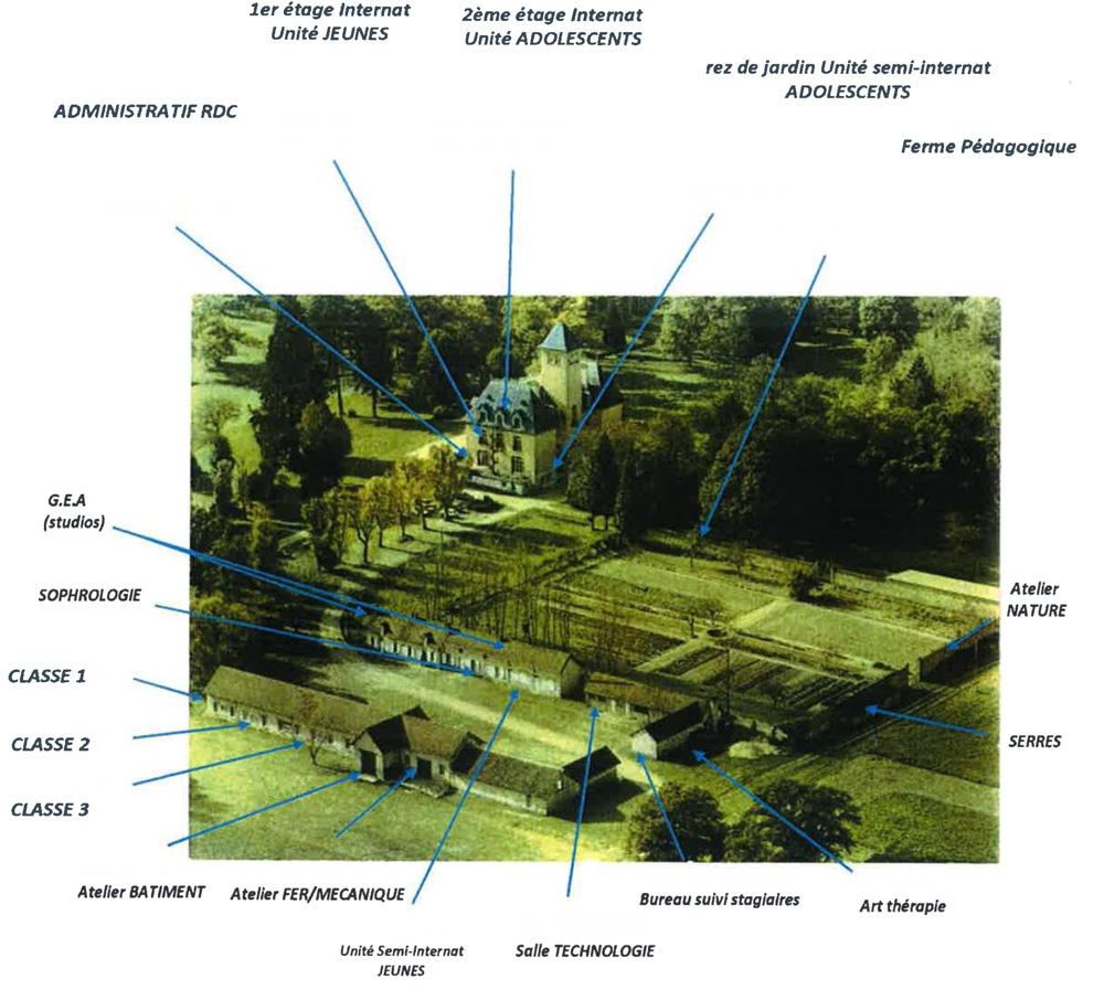 - Un château qui regroupe notamment le pôle administratif au rez-de-chaussée (secrétariat, bureaux…), la cuisine de l’établissement (au sous-sol) et 3 unités de vie pour les jeunes.